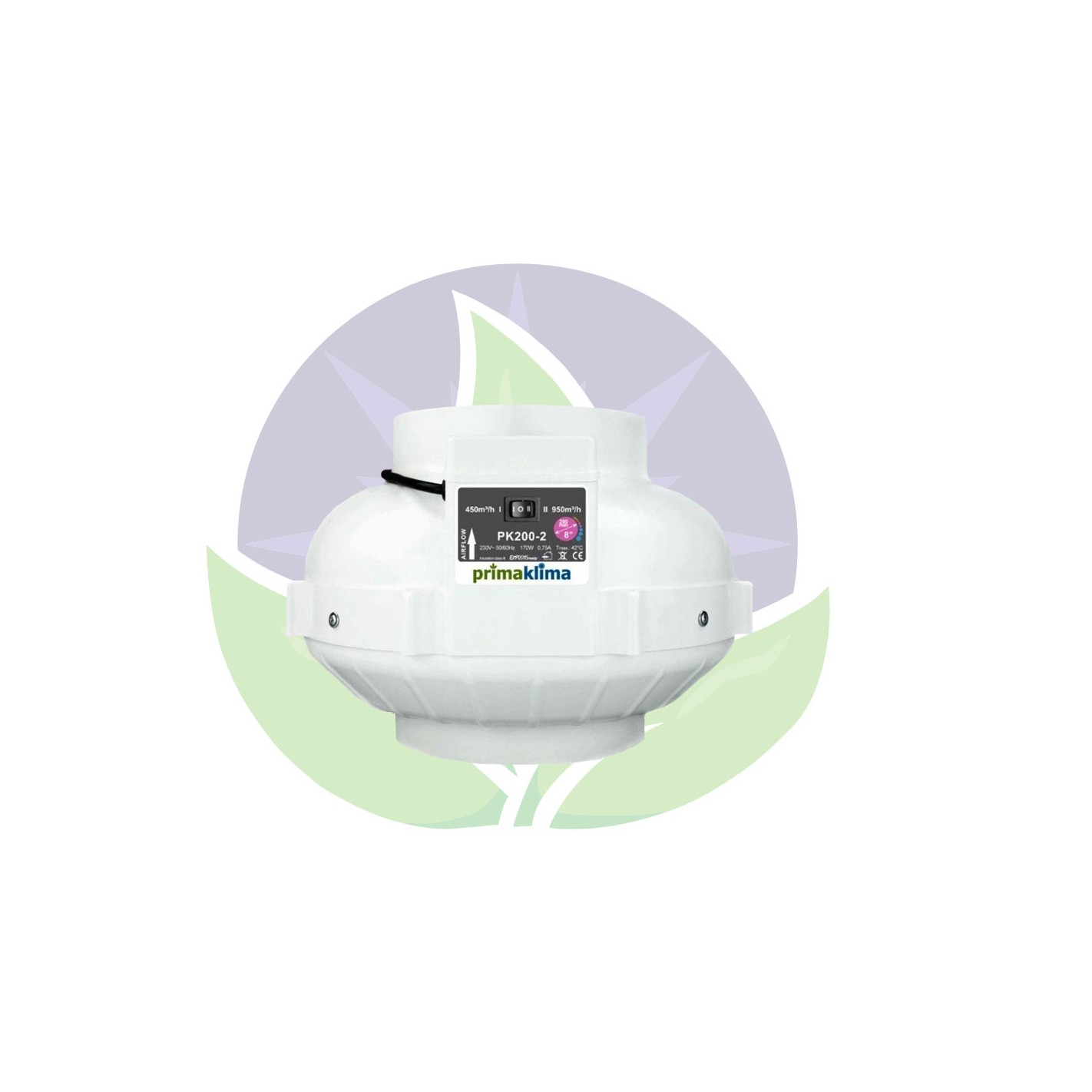 Discover the PK200-2 air extractor from Primaklima. This dual-speed extractor provides an airflow of 450m³/h or 950m³/h thanks to its 170W centrifugal motor. The inlet and outlet flanges are 200 mm in diameter.
