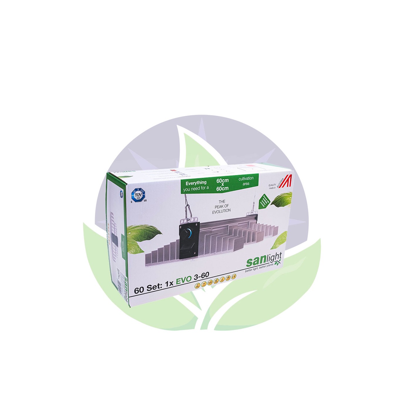 Ideally, the EVO 3 range should be used in a grow area 60 cm deep. For optimum results, this luminaire is recommended for a growing surface of 60 x 60 cm. With the Sanlight range, you can change the angle of the luminaire to adjust the radiation characteristics for better yields in terms of both quantity and quality.