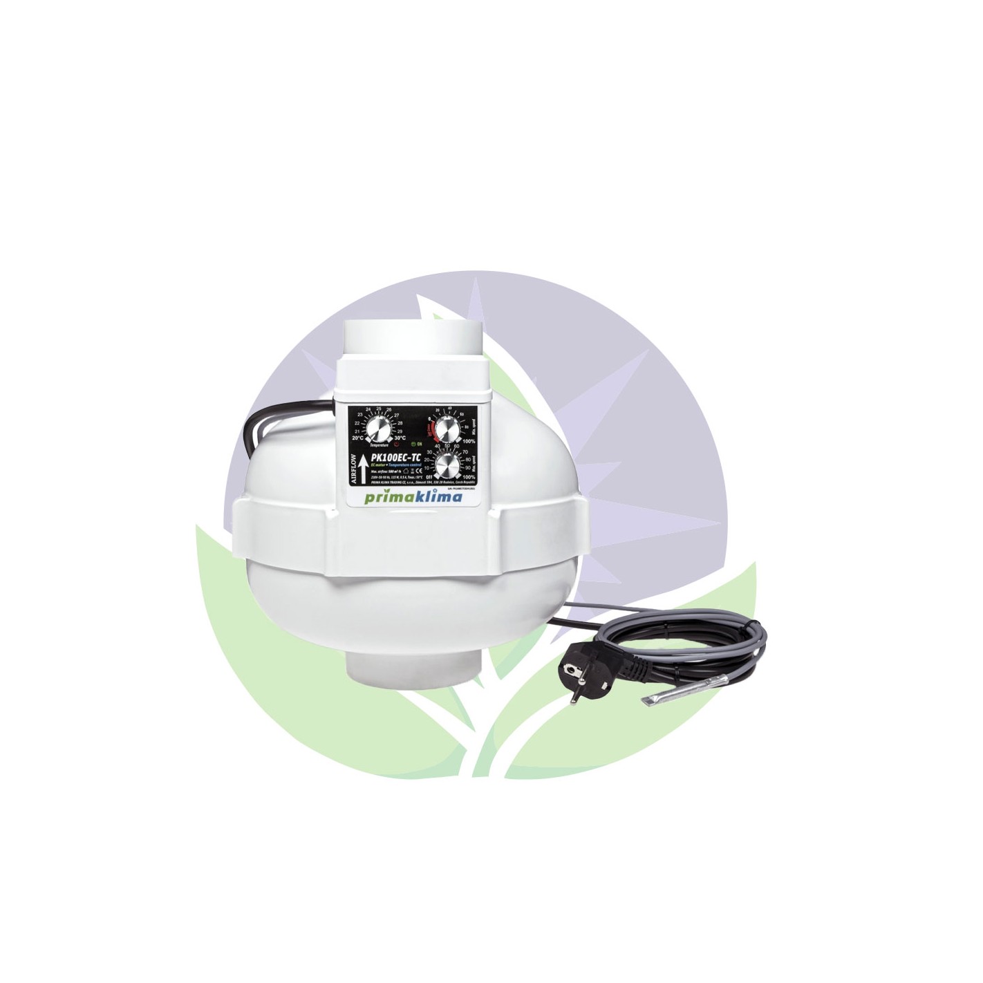 The PK100-TC fan gives you optimum control over your grow tent. As shown below, you will have a knob to set the required temperature (T°C adjustable from 20 to 30°C) and another to set the speed percentage ranging from 0 to 100%. With your programming and the sensor, your extractor will only be activated when necessary.