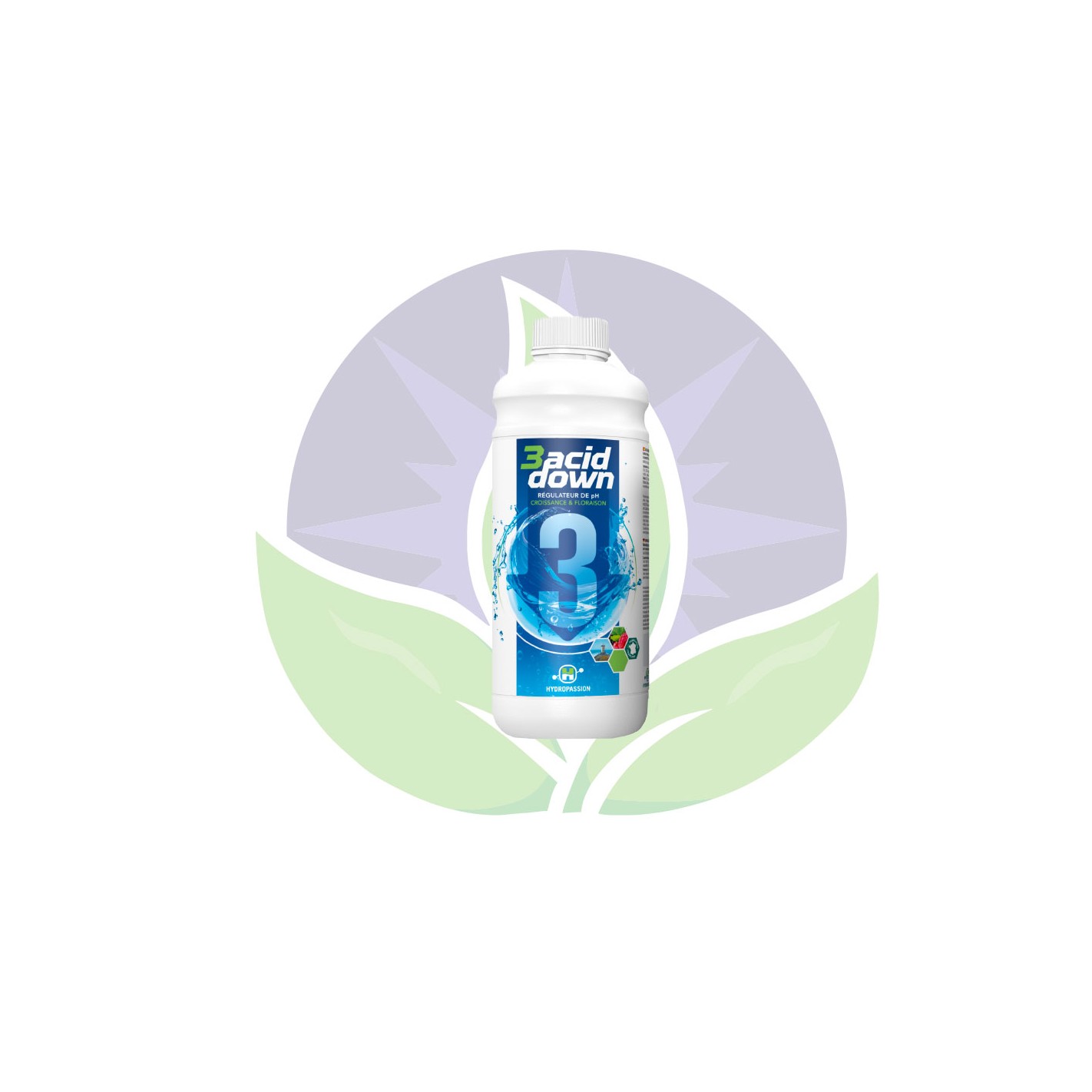 Discover 3 Acid Down from Hydropassion. Made from mineral acid, it will enable you to lower the pH of your nutrient solution on a long-term basis and regulate calcium levels. You can use it during the growth and flowering stages of your crops. For use in soil, hydroponics and aeroponics.