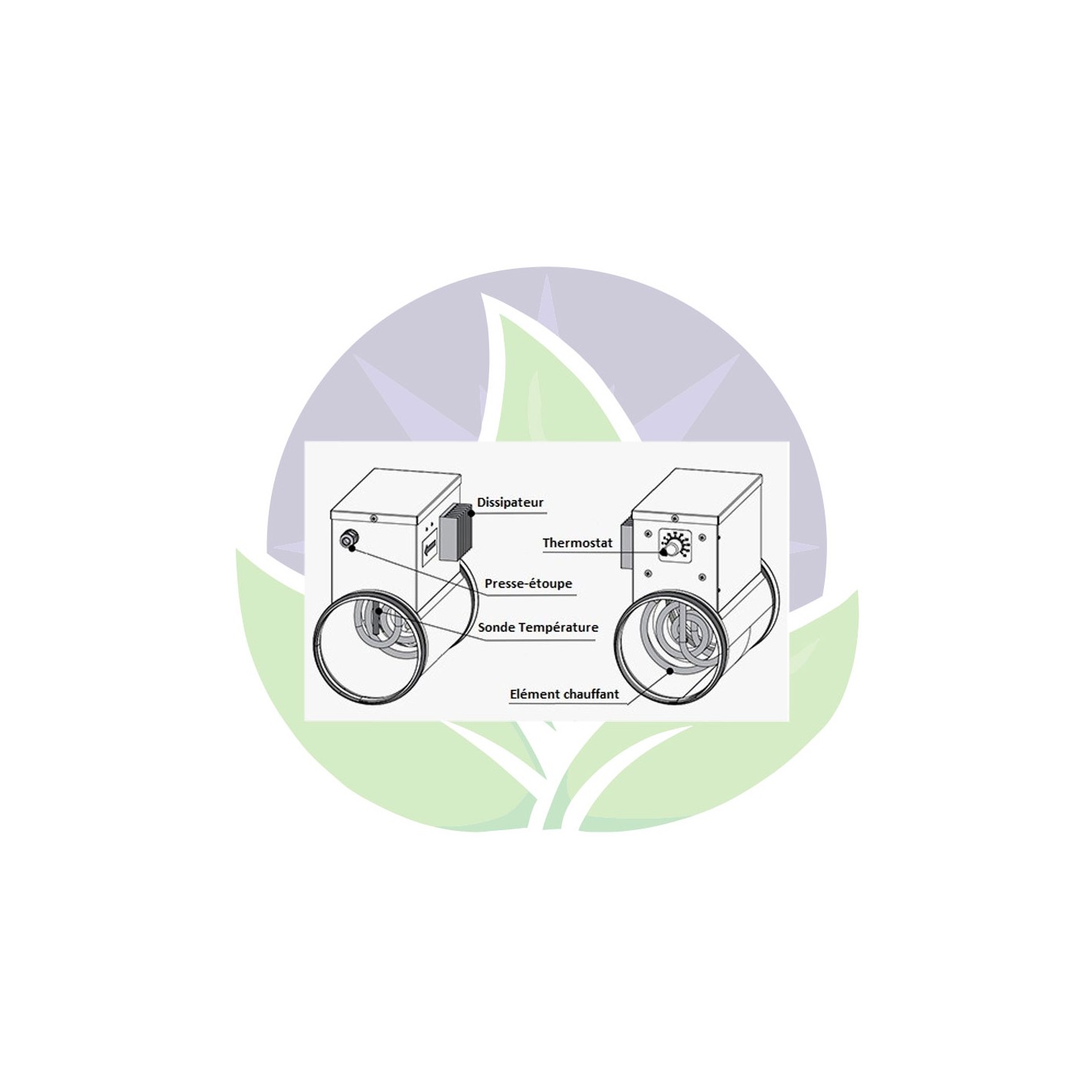 Composé d'un châssis en acier galvanisé sur lequel est fixé la boite de fonction avec son thermostat manuel réglable jusqu'à 40°C. Les entrées de la boite de jonction permettent de passer les câbles de connexions et de mise à la terre. Vous trouverez également le serpentin électrique chauffant tubulaire à l'intérieur du châssis.